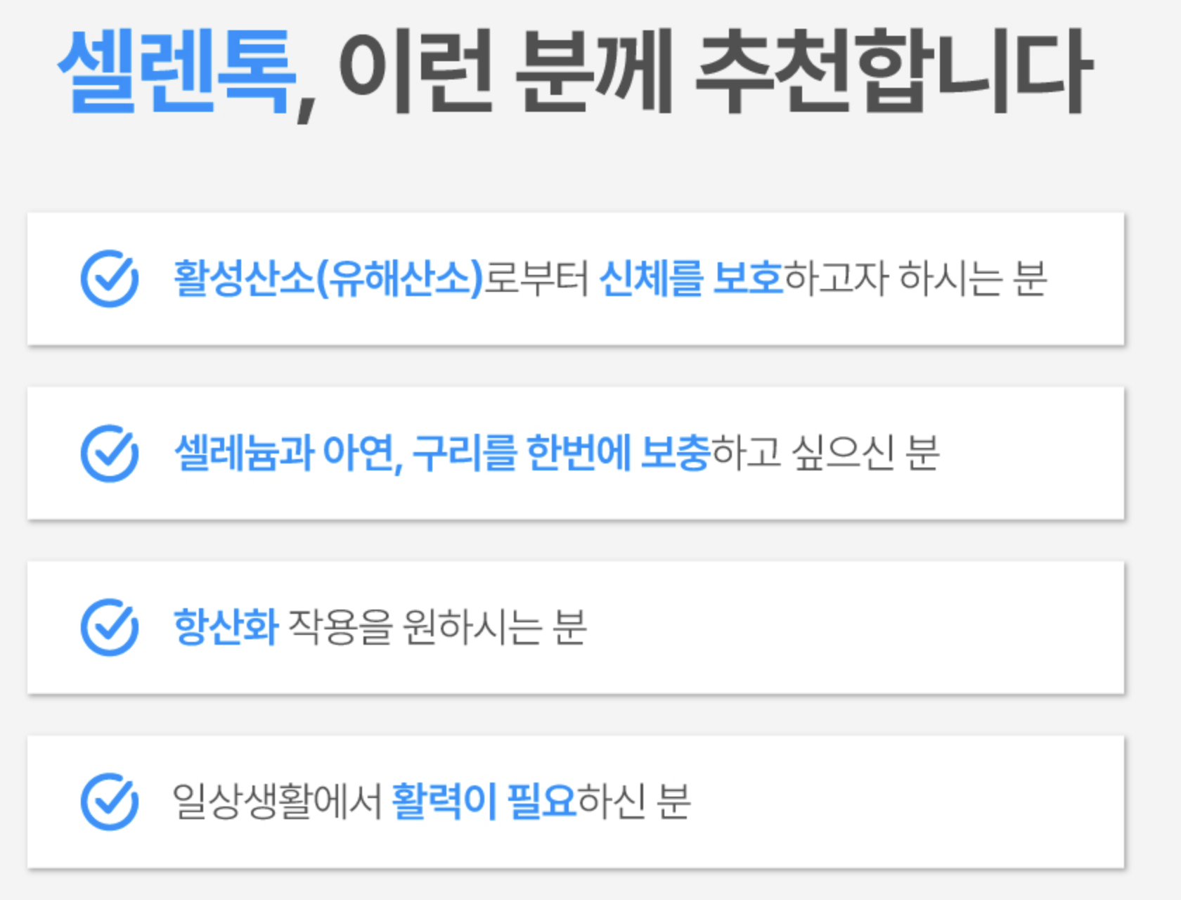 한국 식약처로부터 공식적으로 안정성과 기능성을 인정받은 셀렌톡은, 꾸준히 섭취하면 면역력을 증진시키며 건강에 필수적인 영양소 섭취를 가능하게 하는 믿음직한 선택이랍니다.